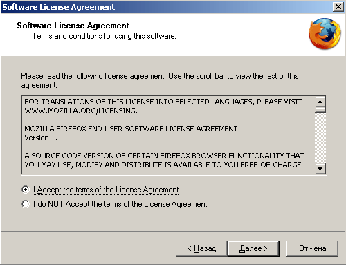 Ознакомившись с лицензионным соглашением, примите решение по установке браузера: если вы соглаcны с условиями соглашения продолжайте процесс установки Mozilla Firefox, следуя всем рекомендациям по установке и соглашаясь с настройками по умолчанию (см рис 1); в противном случае установка не будет произведена и вы не сможете пользоваться учебником.