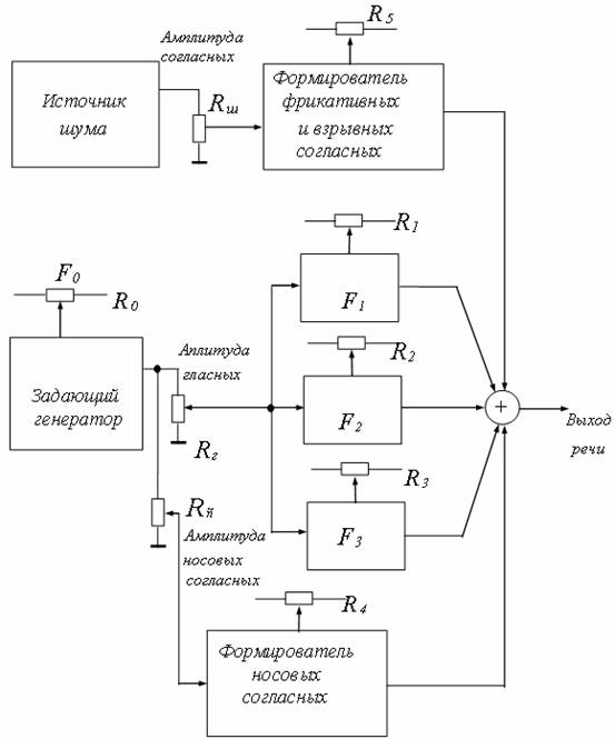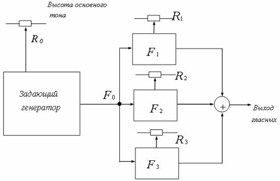 Структурная схема форматного синтезатора гласных звуков включает задающий генератор частоты основного тона, полосовые фильтры, перестраиваемые на формантные частоты, соответствующие синтезируемой фонеме с помощью переменных резисторов
