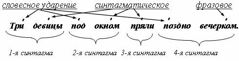 Эти единицы маркируются, соответственно фразовым, синтагматическим, групповым и словесным ударениями. Каждой синтагме присваивается один из возможных интонационных типов. Это завершенность, незавершенность, вопрос или восклицание.