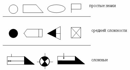 Время считывания непостоянно и зависит от угловых размеров символов, световых характеристик, сложности индицируемых знаков. Чем сложнее символ, тем больше времени требуется на его опознание. Алфавит индицируемых знаков в СОИ подразделяется на простые, средней сложности и сложные (рис. 9.3).