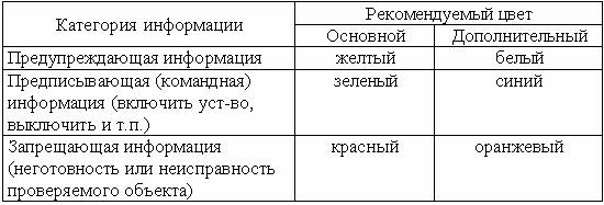Если используется несколько цветов, то выбирают наиболее различающиеся и точно опознаваемые. Цвет фона выбирают нейтральным по отношению к цветам, взятым в качестве кодовых символов. Чем темнее фон, тем меньше влияние посторонней засветки. Лучшим является серый цвет. Цветовое кодирование используется и для воспроизведения сигналов опасности. Сигналами опасности являются теплые тона, безопасности - холодные. Например: желтый - предупреждение, красный - остановка оборудования.